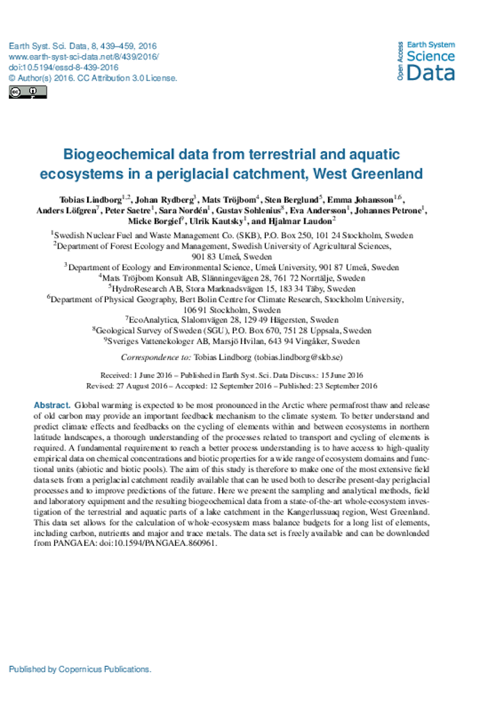 Lindborg, Tobias; Rydberg, Johan; Tröjbom, Mats; Berglund, Sten; Johansson, Emma; Löfgren, Anders, Saetre, Peter; Nordén, Sara; Sohlenius, Gustav; Andersson, Eva; Petrone, Johannes; Borgiel, Micke; Kautsky, Ulrik; Laudon, Hjalmar