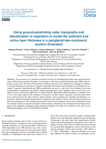 Using ground-penetrating radar, topography and classification of vegetation to model the sediment and active layer thickness in a periglacial lake catchment, western Greenland
