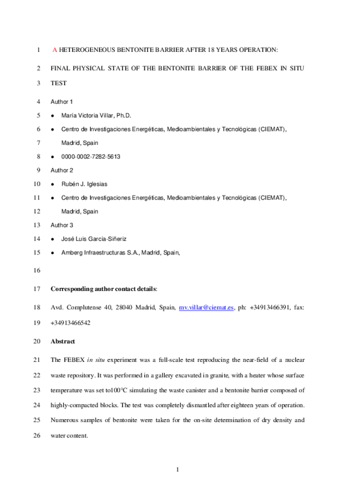 State of the in situ Febex test (GTS, Switzerland) after 18 years: a heterogeneous bentonite barrier