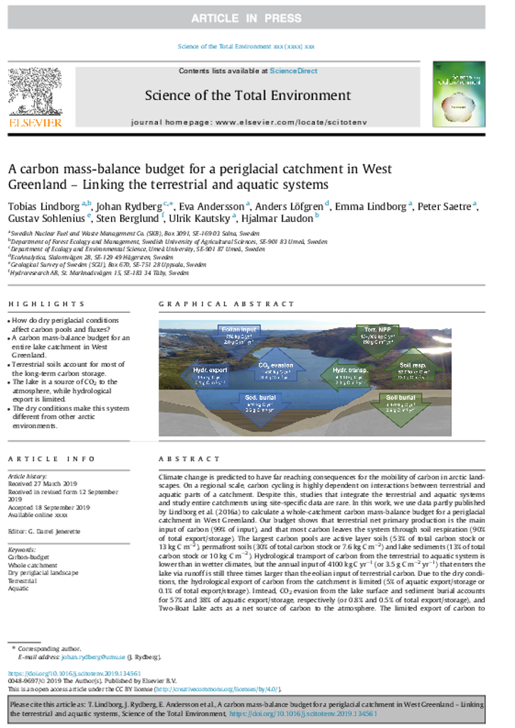 A carbon mass-balance budget for a periglacial catchment in West Greenland - Linking the terrestrial and aquatic systems
