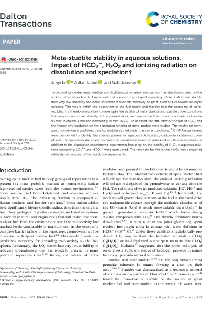 This research has received funding from Swedish Nuclear Fuel and Waste Management Co