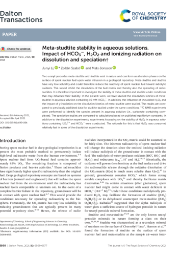 Meta-studtite stability in aqueous solutions. Impact of HCO3−, H2O2 and ionizing radiation on dissolution and speciation