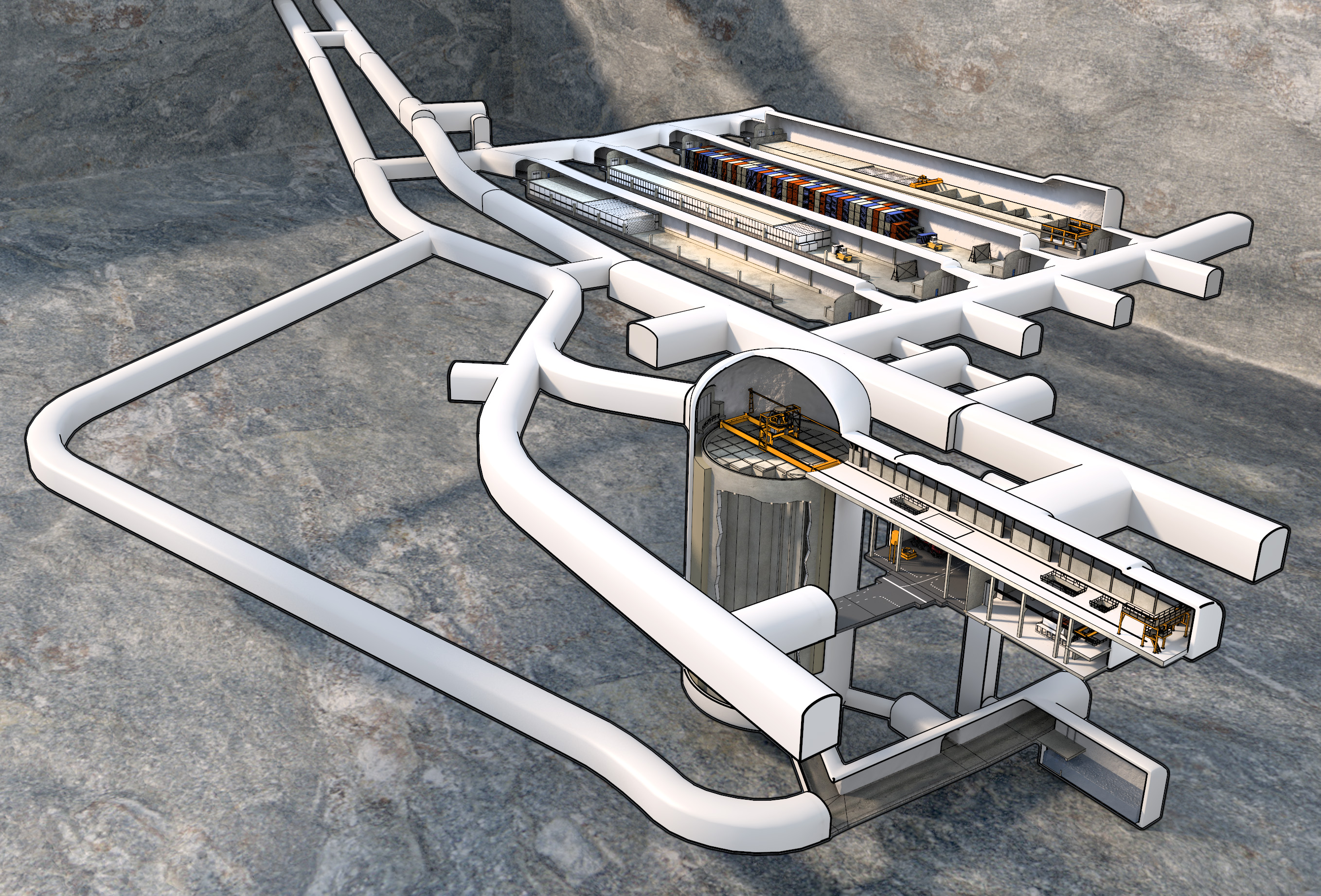 The SFR is situated 60 metres below the bottom of the Baltic and comprises four 160-metre long rock vaults and a chamber in the bedrock with a 50-metre high concrete silo for the most radioactive waste. Two parallel kilometre-long access tunnels link the facility to the surface.