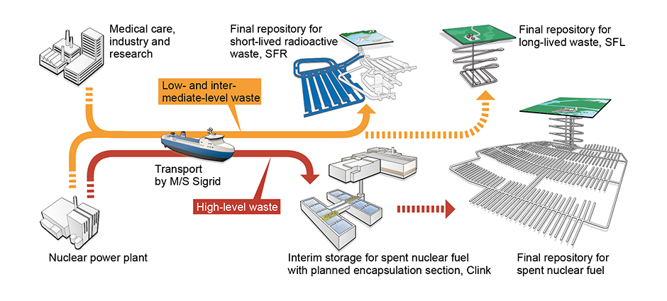 This is where operational waste from nuclear power plants, which includes used protective clothing, replaced components and filtering materials that have been used to decontaminate reactor water, is deposited. Radioactive waste from hospitals, industry and research is also kept here. The repository is located at Forsmark in bedrock about 50 metres below sea level.