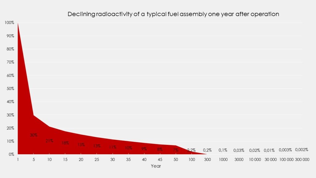 Why does the curve look like this for the spent nuclear fuel? This is due to what is known as the half-life, i.e. the time it takes for half of a radioactive substance’s atomic nuclei to decompose. After a half-life, half of the original number of atoms remain, after another half-life, a quarter remain, and so on.