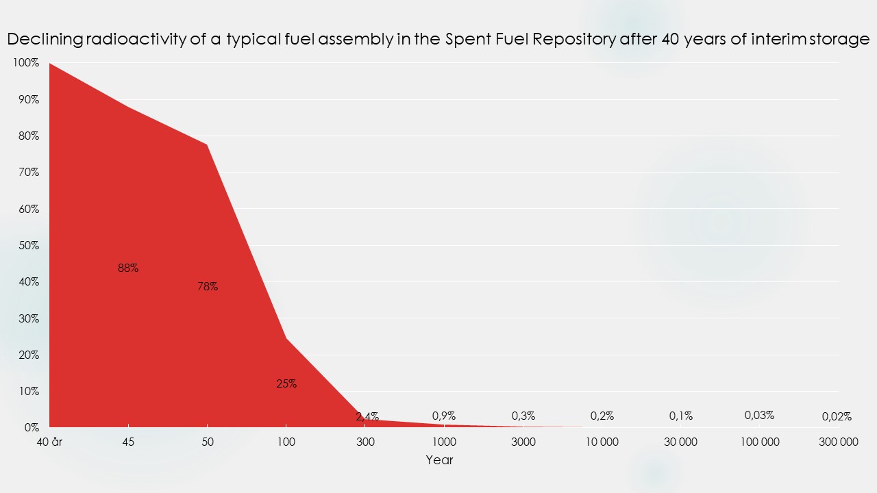 After 1,000 years, activity is dominated by substances that are dangerous to ingest. Radioactivity has then fallen by a further 99% compared with when the fuel arrived at the Spent Fuel Repository.
