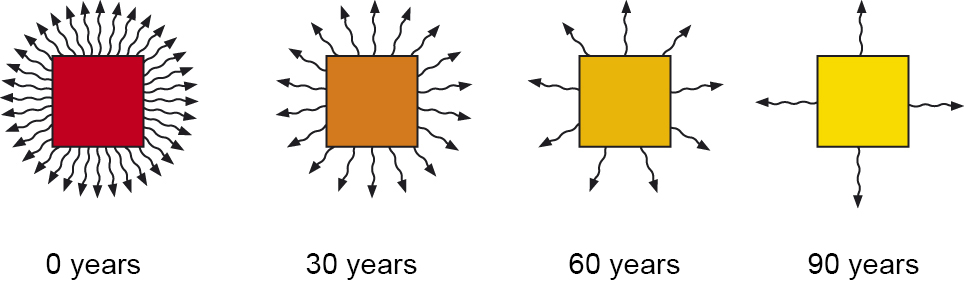 When radioactive atoms decompose and form new, stable substances, fewer radioactive atoms remain. Activity therefore decreases. The figure illustrates a substance with a half-life of 30 years.
