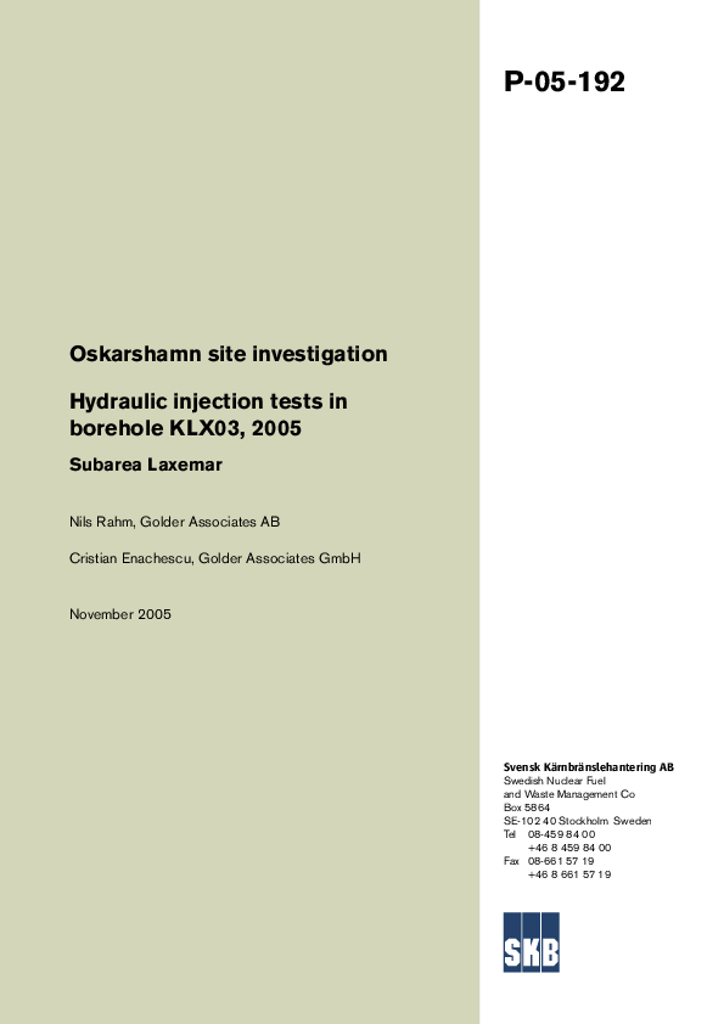Oskarshamn site investigation. Hydraulic injection tests in borehole KLX03, 2005. Subarea Laxemar