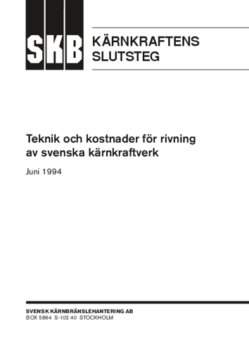 SKB Kärnkraftens slutsteg. Teknik och kostnader för rivning av svenska kärnkraftverk Juni 1994