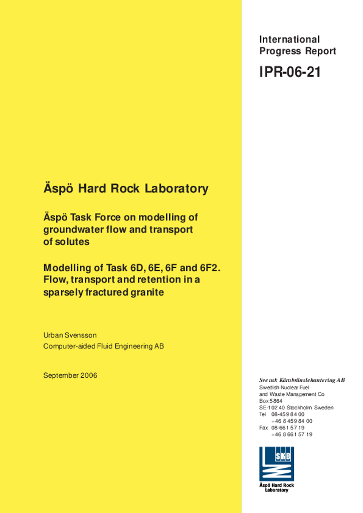 Äspö Hard Rock Laboratory. Äspö Task Force on modelling of groundwater flow and transport of solutes. Modelling of Task 6D, 6E, 6F and 6F2. Flow, transport and retention in a sparsely fractured granite