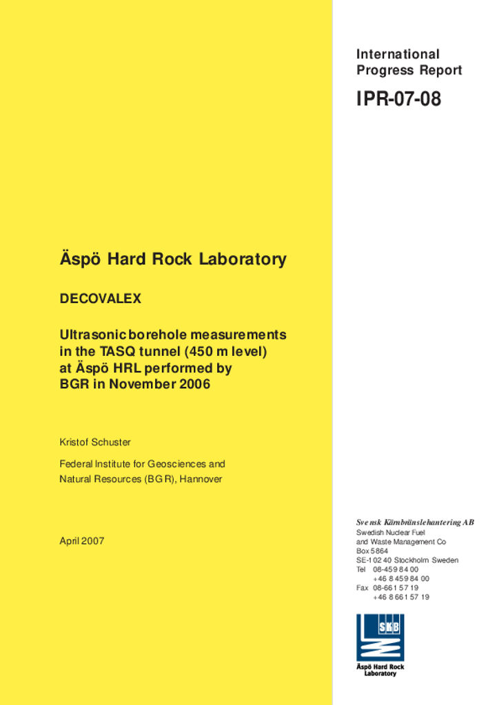 DECOVALEX. Ultrasonic borehole measurements in the TASQ tunnel (450 m level) at Äspö HRL performed by BGR in November 2006