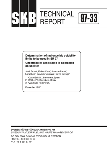Determination of radionuclide solubility limits to be used in SR 97. Uncertainties associated to calculated solubilities