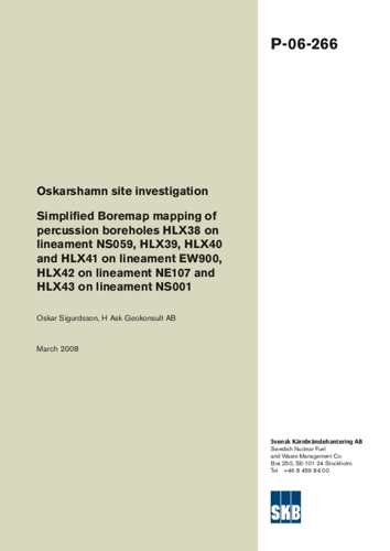 Oskarshamn site investigation. Simplified Boremap mapping of percussion boreholes HLX38 on lineament NS059, HLX39, HLX40 and HLX41 on lineament EW900, HLX42 on lineament NE107 and HLX43on lineament NS001