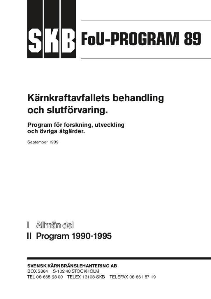 FoU-PROGRAM 89. Kärnkraftavfallets behandling och slutförvaring. Program för forskning, utveckling och övriga åtgärder. [Del II Program 1990-1995]