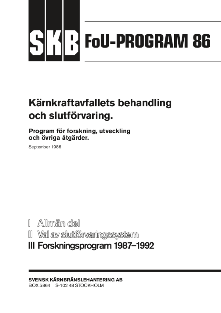 FoU-PROGRAM 86. Kärnkraftavfallets behandling och slutförvaring. Program för forskning, utveckling och övriga åtgärder [Del III Forskningsprogram 1987-1992]