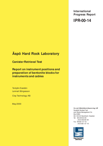 Äspö Hard Rock Laboratory. Canister retrieval test. Report on instrument positions and preparation of bentonite blocks for instruments and cables
