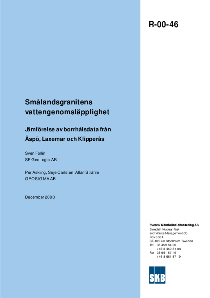Smålandsgranitens vattengenomsläpplighet. Jämförelse av borrhålsdata från Äspö, Laxemar och Klipperås