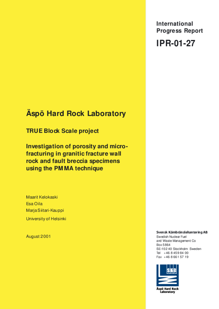 Äspö Hard Rock Laboratory. TRUE Block Scale project. Investigation of porosity and microfracturing in granitic fracture wall rock and fault breccia specimens using the PMMA technique