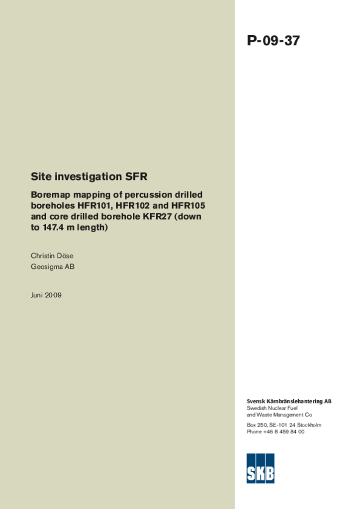 Site investigation SFR. Boremap mapping of percussion drilled boreholes HFR101, HFR102 and HFR105 and core drilled borehole KFR27 (down to 147.4 m length)