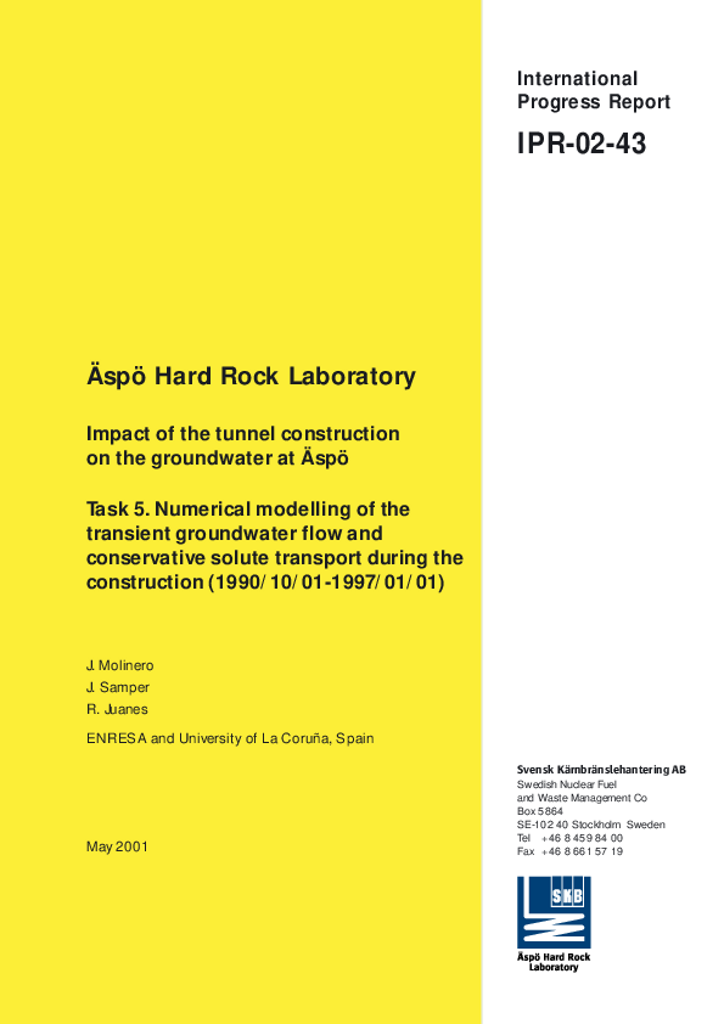 Äspö Hard Rock Laboratory. Impact of the tunnel construction on the groundwater at Äspö. Task 5. Numerical modelling of the transient groundwater flow and conservative solute transport during the construction (1990/10/01-1997/01/01)