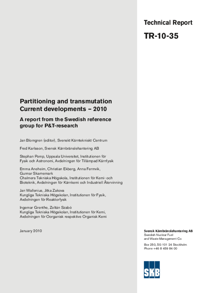 Blomgren, Jan (editor); Karlsson, Fred; Pomp, Stephan; Aneheim, Emma; Ekberg, Christian; Fermvik, Anna; Skarnemark, Gunnar; Wallenius, Jan; Zakova, Jitka; Grenthe, Ingemar; Szabó, Zoltán