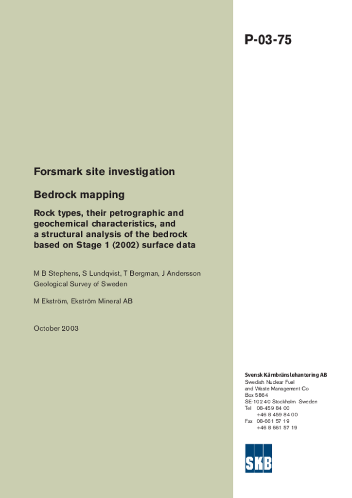 Forsmark site investigation. Bedrock mapping. Rock types, their petrographic and geochemical characteristics, and a structural analysis of the bedrock based on Stage 1 (2002) surface data
