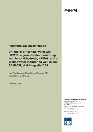 Forsmark site investigation. Drilling of a flushing water well, HFM10, a groundwater monitoring well in solid bedrock, HFM09, and a groundwater monitoring well in soil, SFM0057, at drilling site DS4