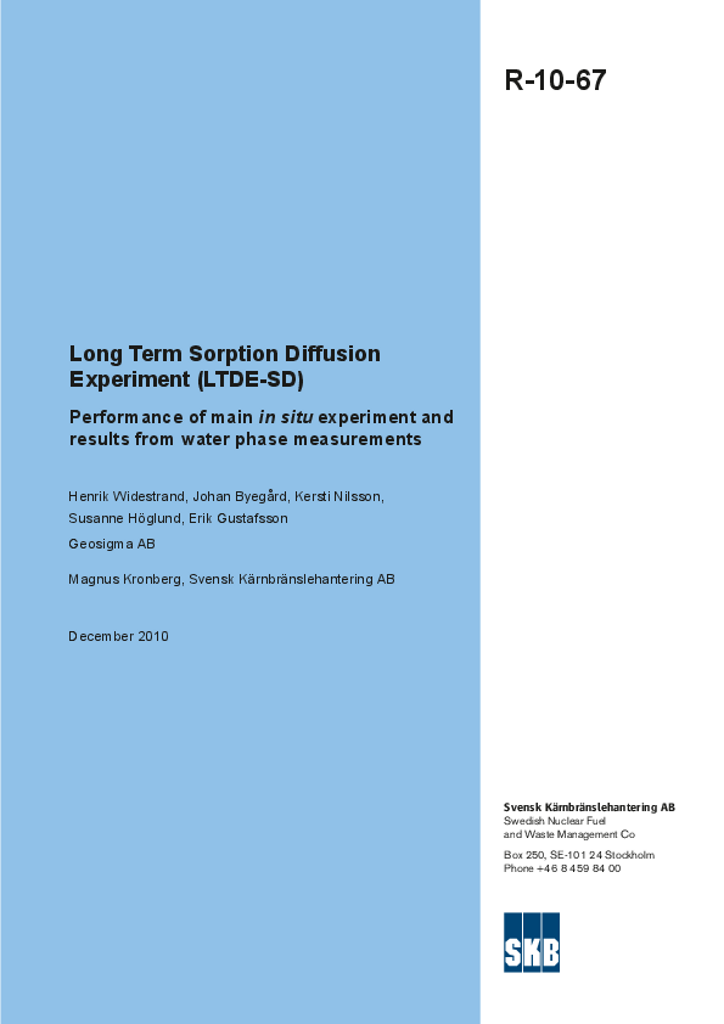 Long Term Sorption Diffusion Experiment (LTDE-SD) Performance of main in situ experiment and results from water phase measurements