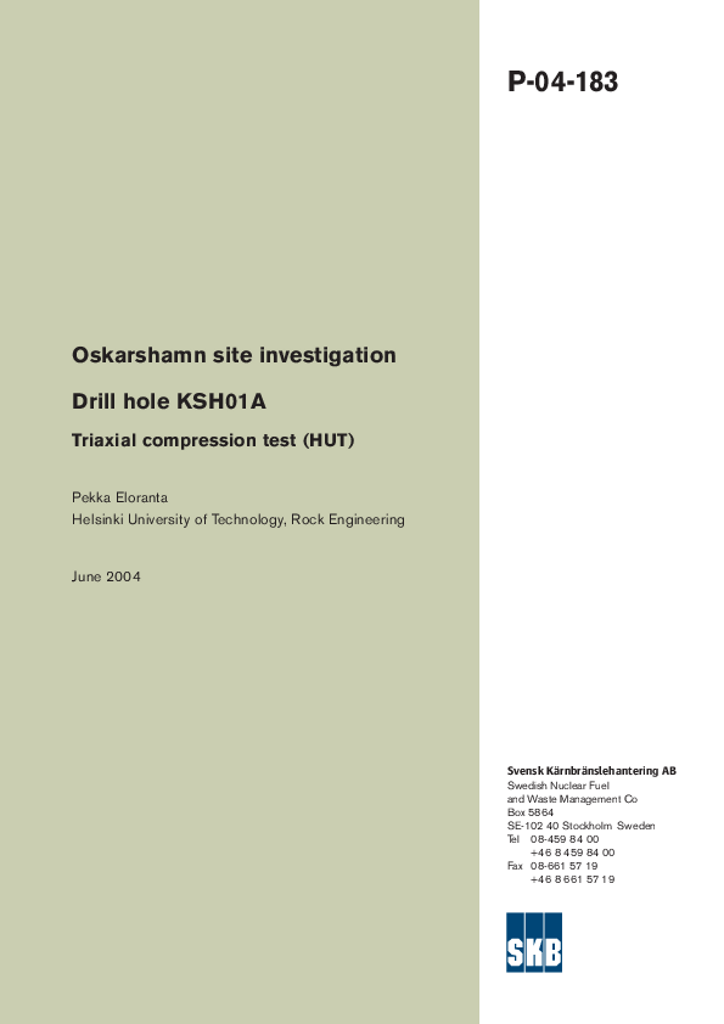 Oskarshamn site investigation. Drill hole KSH01A. Triaxial compression test (HUT)