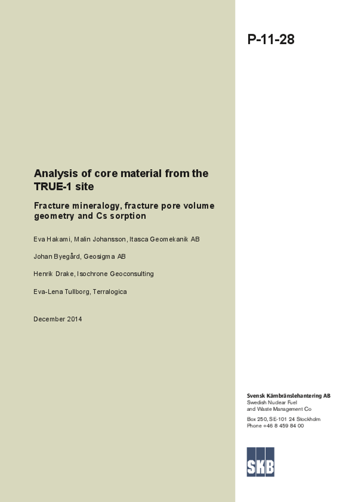 Analysis of core material from the TRUE-1 site. Fracture mineralogy, fracture pore volume geometry and Cs sorption