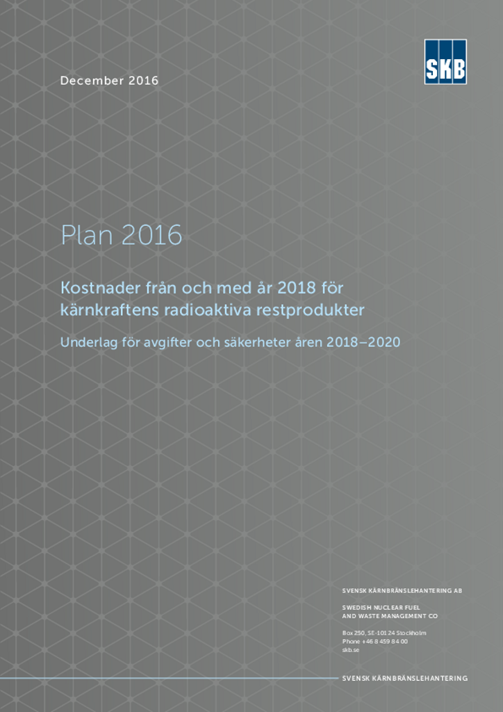 Plan 2016. Kostnader från och med år 2018 för kärnkraftens radioaktiva restprodukter. Underlag för avgifter och säkerheter åren 2018-2020