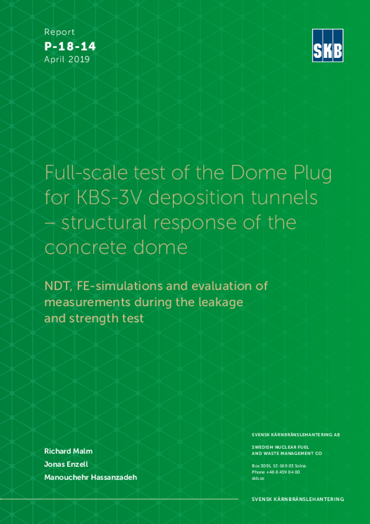 Full-scale test of the Dome Plug for KBS-3V deposition tunnels - structural response of the concrete dome. NDT, FE-simulations and evaluation of measurements during the leakage strength test
