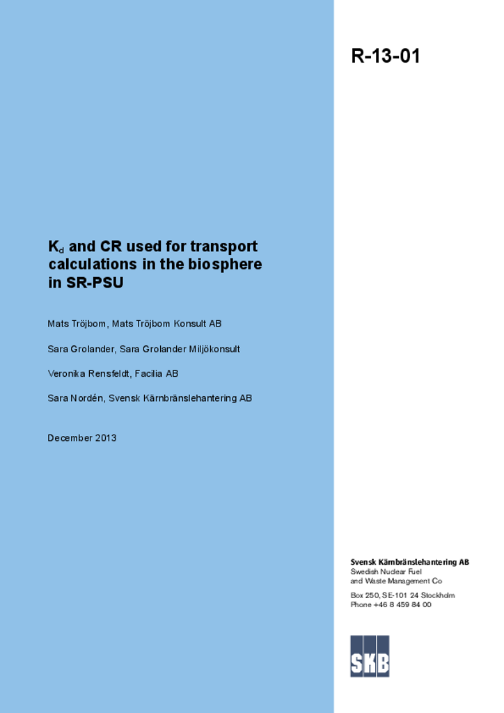 Kd and CR used for transport calculations in the biosphere in SR-PSU. Updated 2016-10