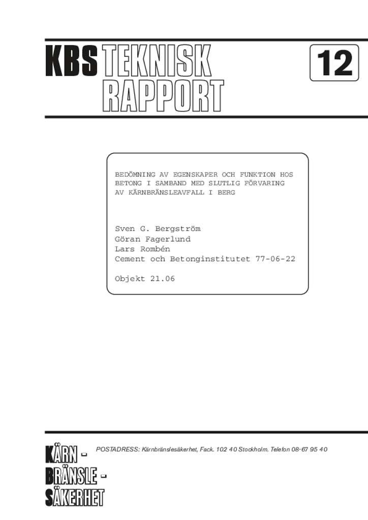 Bedömning av egenskaper och funktion hos betong i samband med slutlig förvaring av kärnbränsleavfall i berg (Evaluation of properties and function of concrete in connection with final storage of nuclear fuel waste in rock)