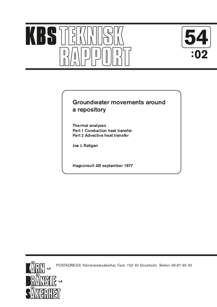 Groundwater movements around a repository. Several reports 54:01 - 54:06. 54:02 Thermal analyses. Part 1 Conduction heat transfer. Part 2 Advective heat transfer