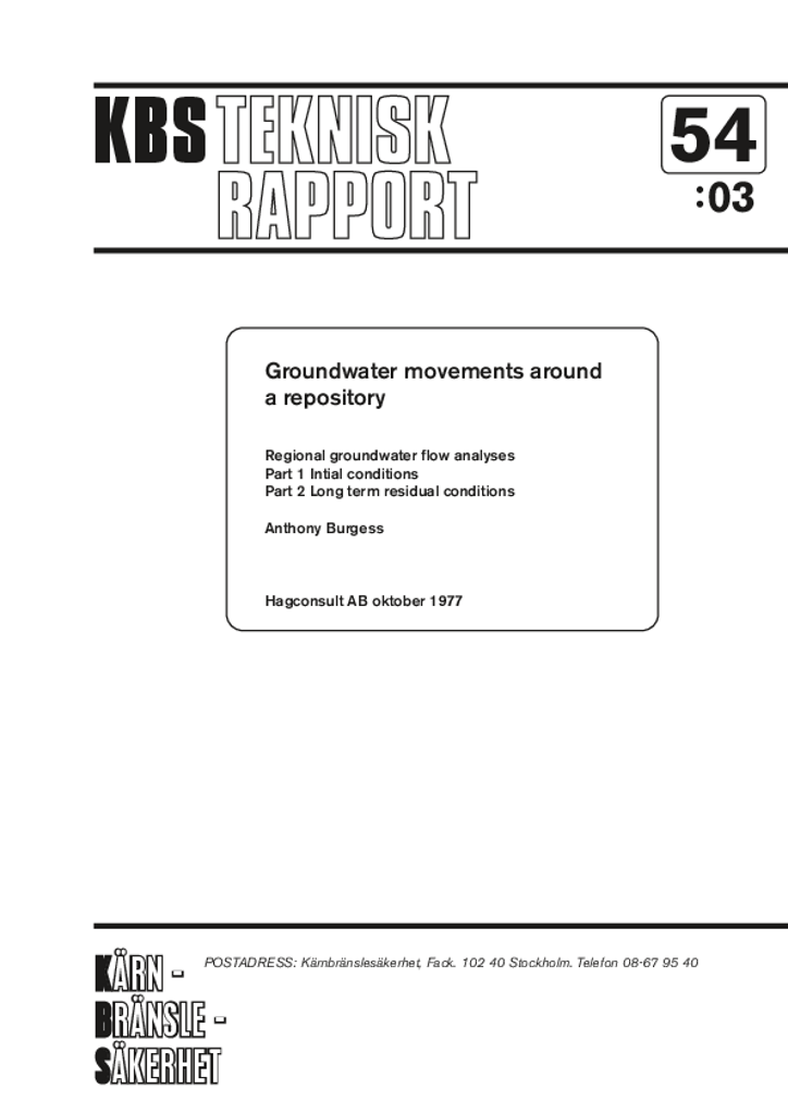 Groundwater movements around a repository. Several reports 54:01 - 54:06. 54:03 Regional groundwater flow analyses. Part 1 Initial conditions. Part 2 Long term residual conditions