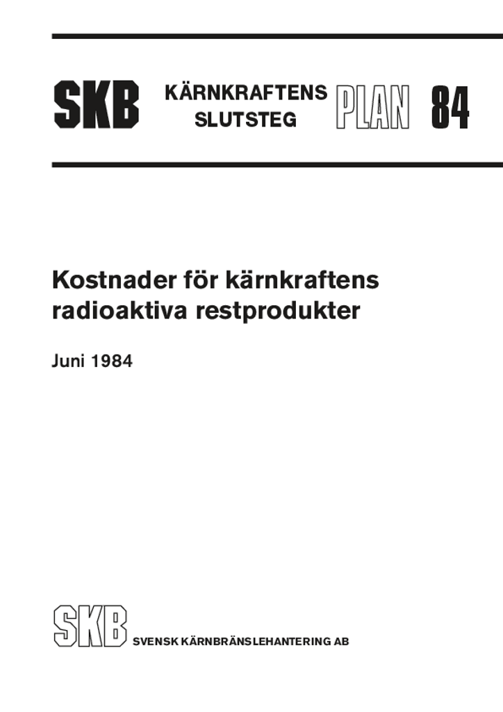 SKB Kärnkraftens slutsteg PLAN 84. Kostnader för kärnkraftens radioaktiva restprodukter. Juni 1984