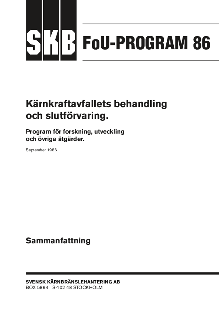 FoU-Program 86. Kärnkraftavfallets behandling och slutförvaring. Program för forskning, utveckling och övriga åtgärder. Sammanfattning