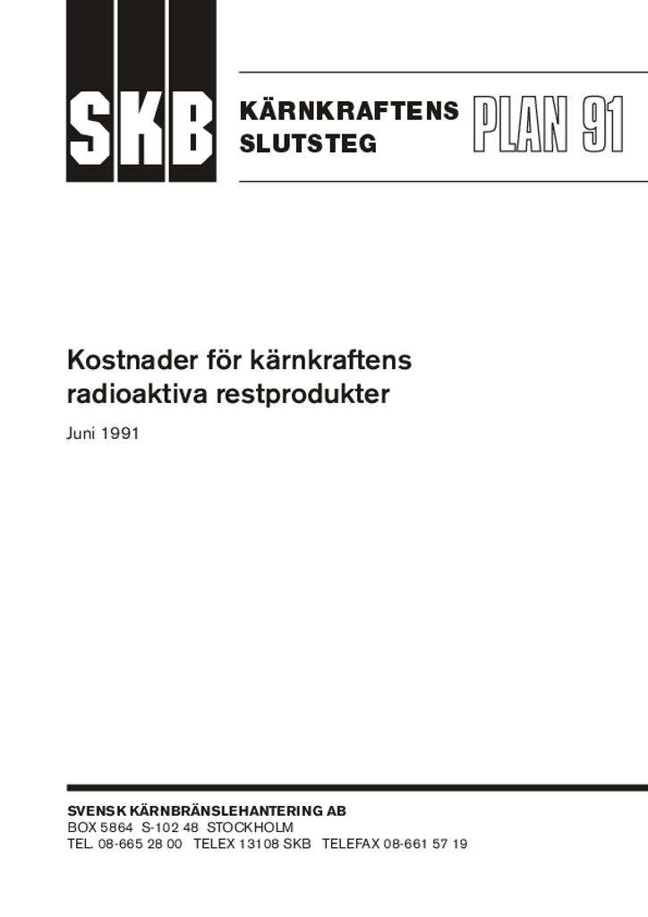 SKB Kärnkraftens slutsteg PLAN 91. Kostnader för kärnkraftens radioaktiva restprodukter
