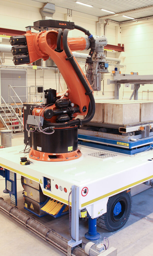 In the Multipurpose test facility, experiments and trials are conducted with bentonite clay in various forms. Equipment is available for mixing bentonite material, producing pellets, and tools for lifting buffer rings. A specially adapted stacking robot is used for stacking bentonite blocks.